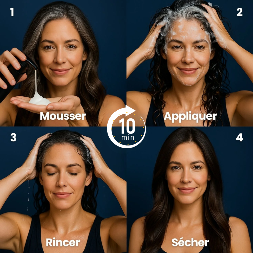 En 10 minutes, les reflets gris s’estompent, la couleur devient plus uniforme, et les cheveux retrouvent éclat et vitalité.